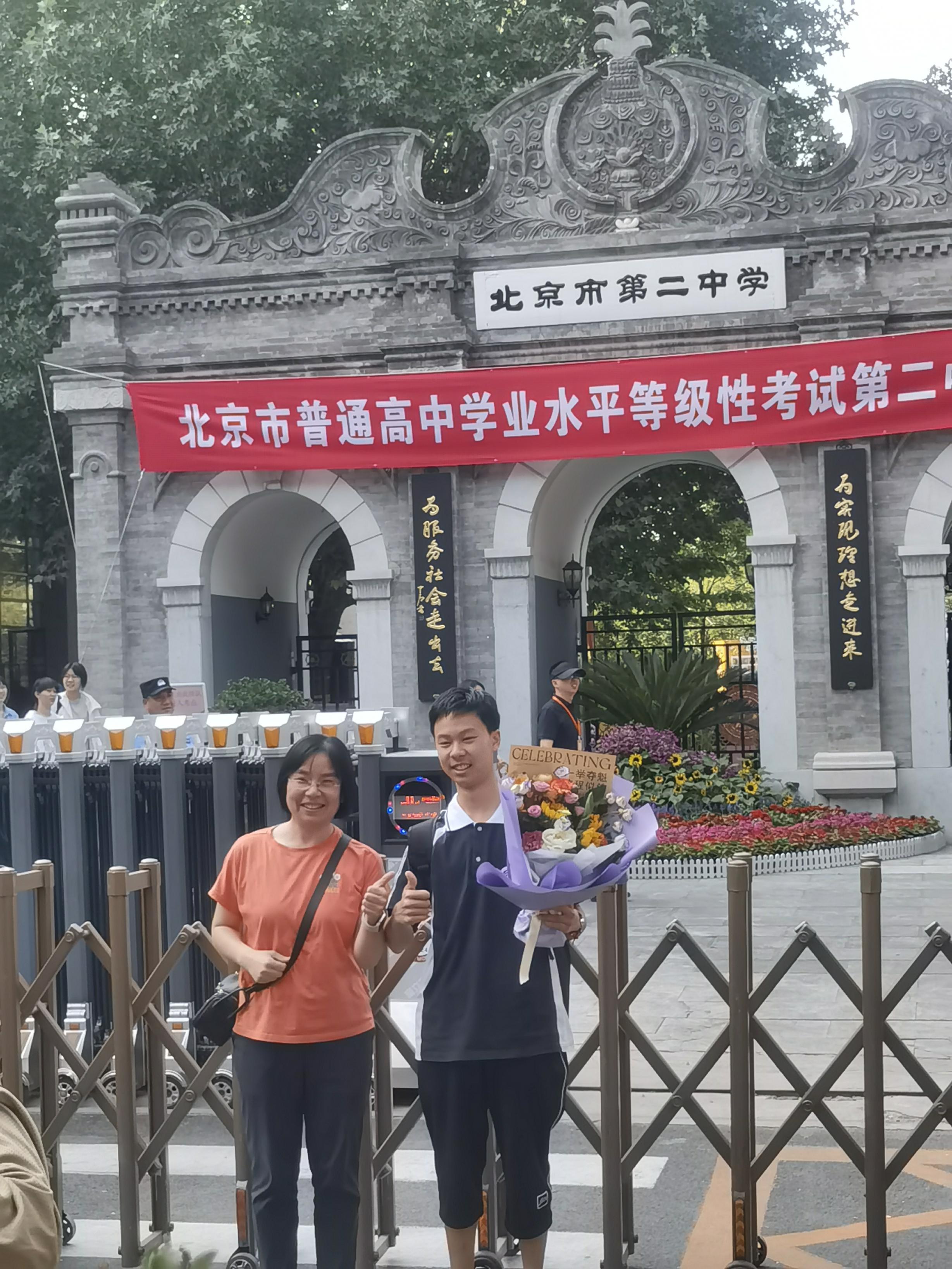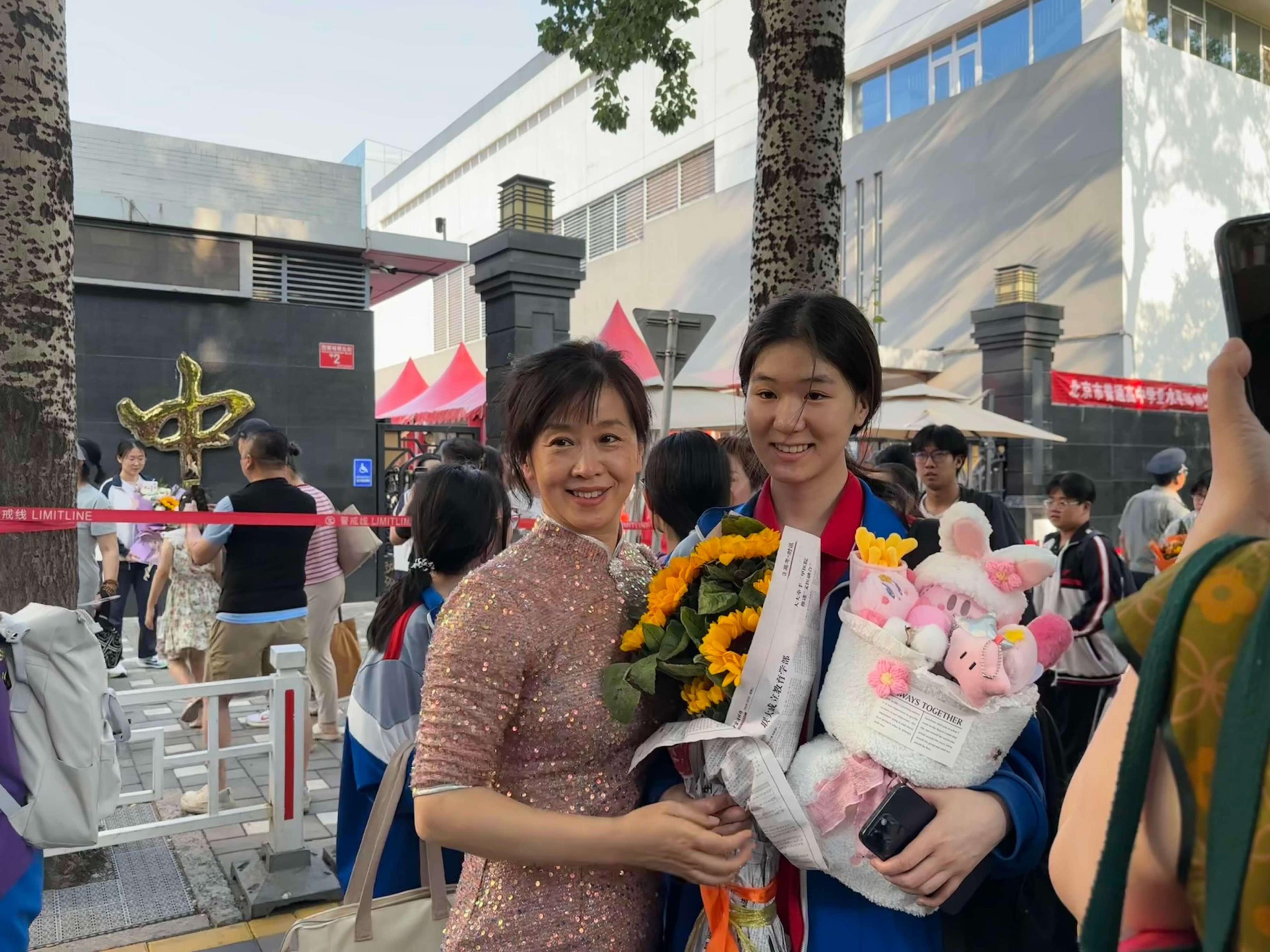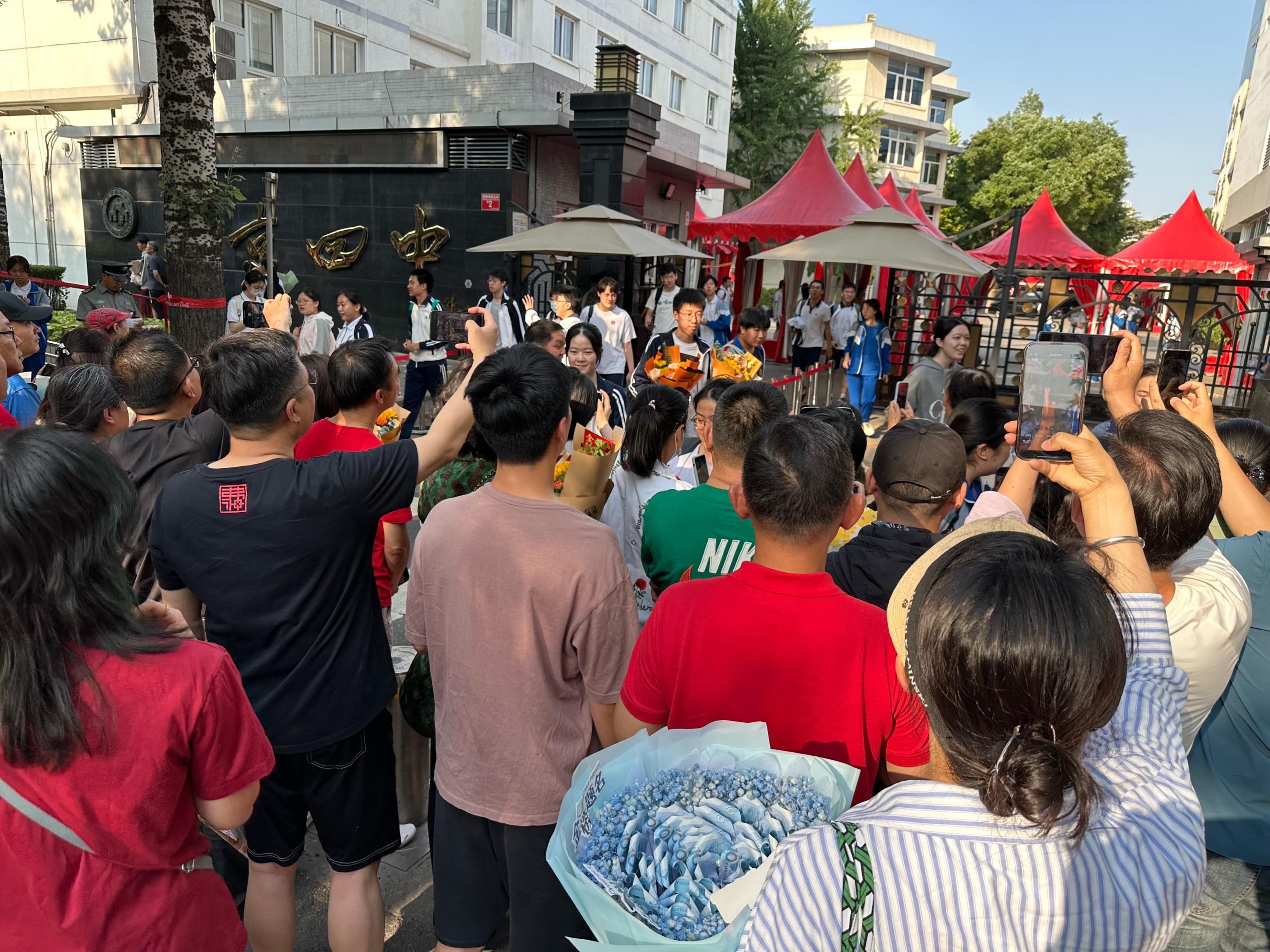 北京市第四中学考点外,家长们手捧鲜花,举着写满祝福语的横幅翘首以盼。只要是考生走出考场,家长们都会热情地欢呼,送上真诚的祝福。