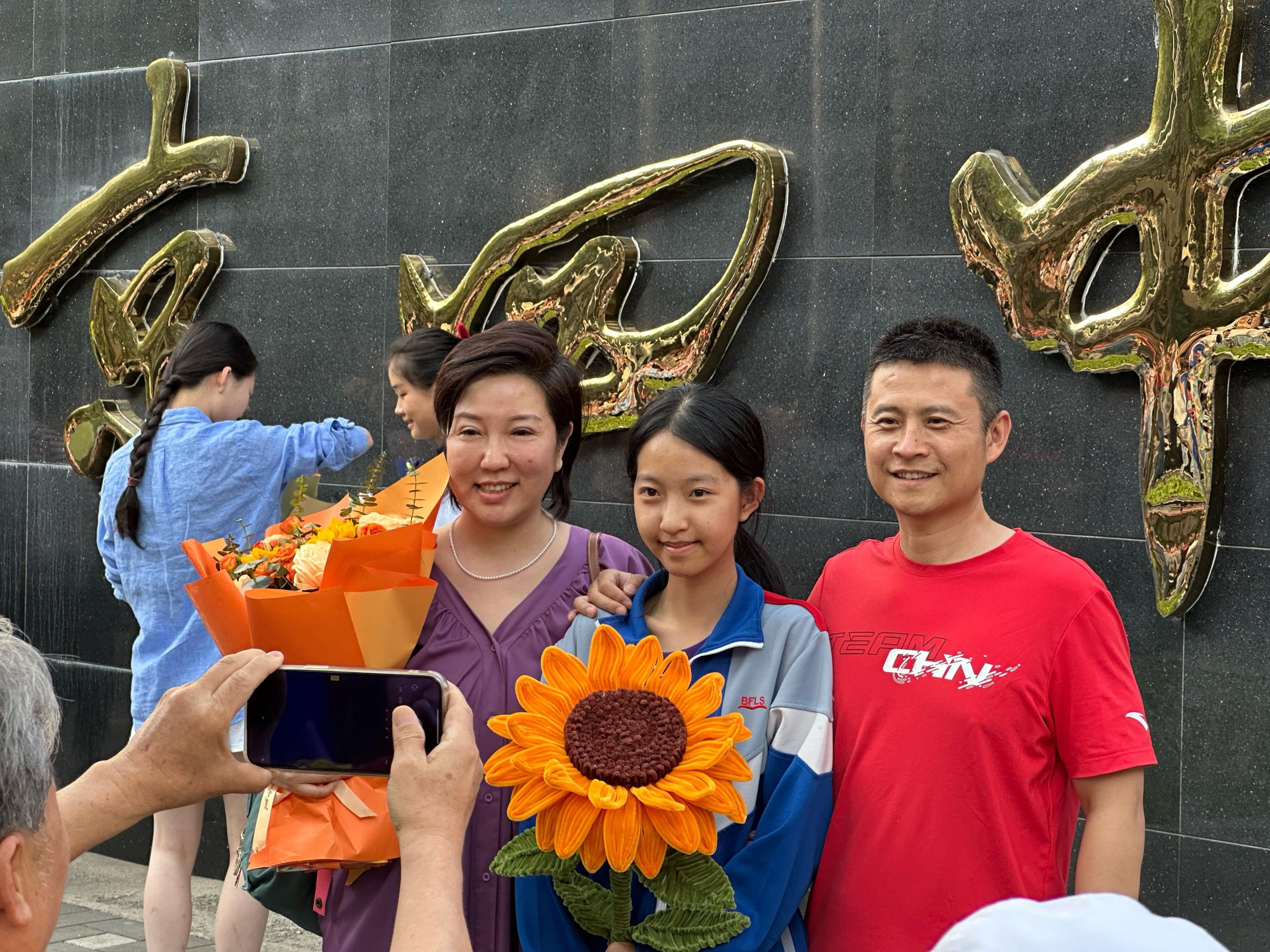 “宝贝,快来!看我们给你准备的惊喜。”看见女儿走出校门,家长张先生和爱人迎过去,送上一束粉嫩的“玩偶花”。女生激动地搂着父母:“感谢爸妈,你们也辛苦了!”